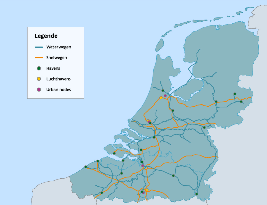 De projecten moeten langsheen het TEN-T kernnetwerk in het Brussels Hoofdstedelijk Gewest, Nederland en/of Vlaanderen liggen of in de onmiddellijke omgeving hiervan. Op onderstaande kaart vindt u terug welke snelwegen, knooppunten en havens binnen de scope van deze projectoproep vallen. Een interactieve kaart van het TEN-T kernnetwerk is beschikbaar via deze link.